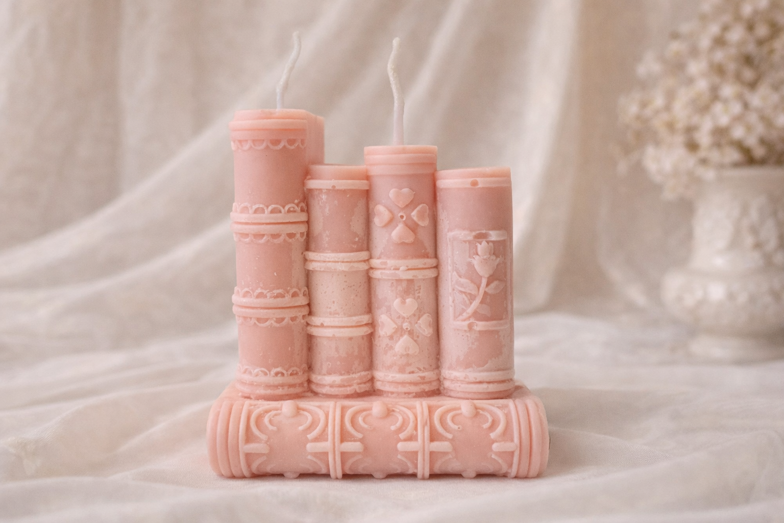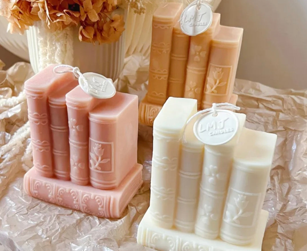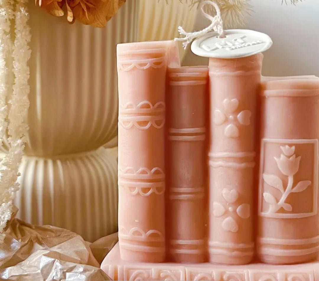 A unique handmade soy wax candle shaped like a book, featuring delicate floral details and a soft pink finish. This elegant decorative candle is perfect for book lovers, romantic interiors, weddings, christenings, or thoughtful gifts. Carefully crafted to add charm, warmth, and a touch of luxury to any space.